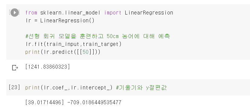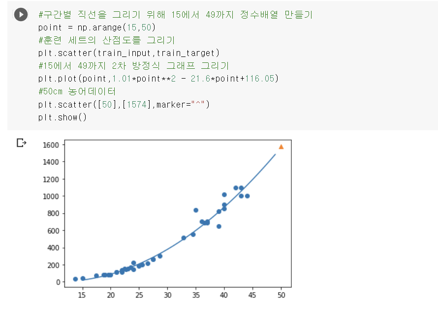 선형 회귀가 만든 직선이 왼쪽 아래로 쭉 뻗어 있다. 농어의 길이와 무게에 대한 산점도를 자세히 보면 일직선이라기보다 왼쪽 위로 조금 구부러진 곡선에 가깝다. 2차 방정식의 그래프를 그리려면 길이를 제곱한 항이 훈련 세트에 추가되어야한다. lr.coef_값과 lr.intercept_값을 구해서 2차 방정식 그래프를 그려야한다.