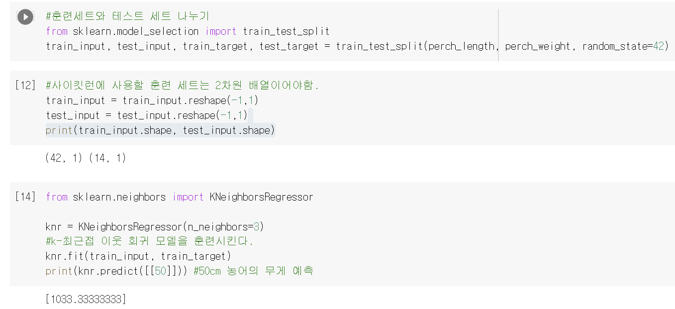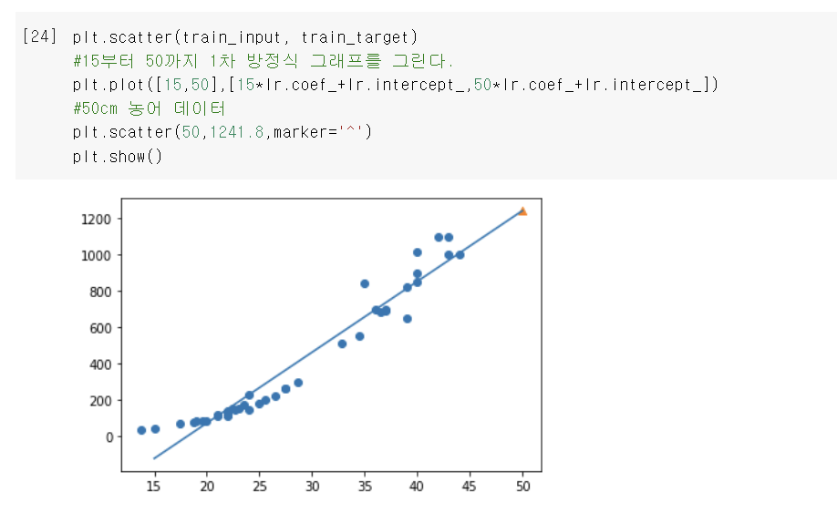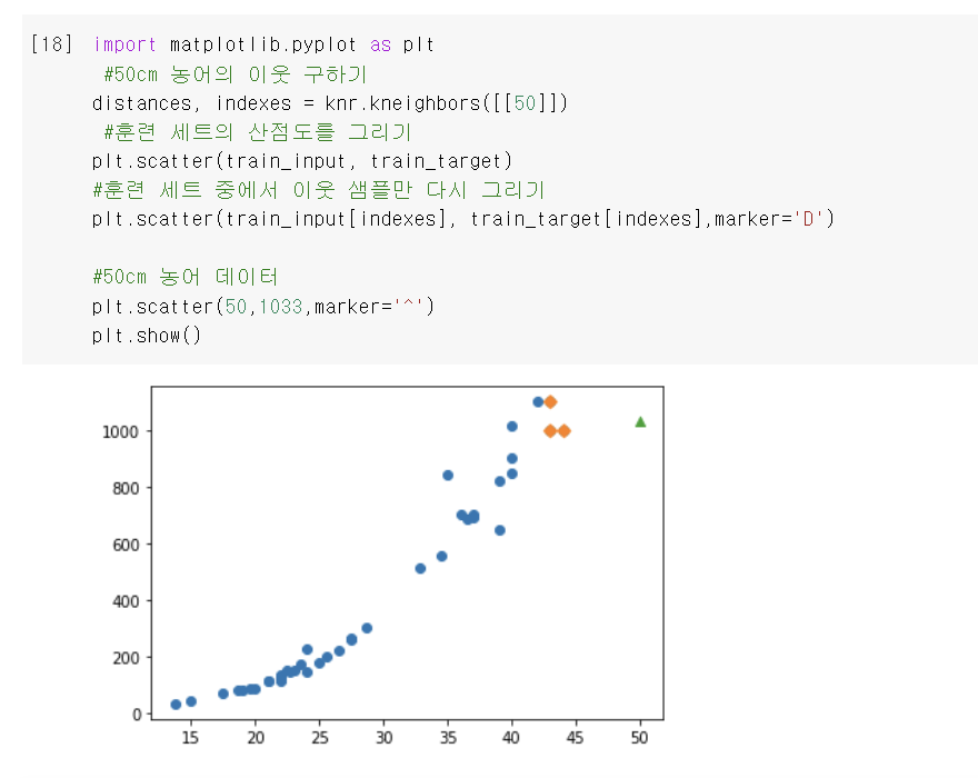 길이가 50cm이고, 무게가 1033g인 농어는 삼각형으로 표시되고 주변 샘플은 다이아몬드로 표시된다. 산점도를 부면 길이가 커질수록 농어의 무게가 증가하는데 최근접 이웃알고리즘에 해당되는 샘플들의 무게 평균은 1033으로 더 작은 값들이다. 따라서 100cm 인 농어도 여전히 1033g으로 예측할 것이다.