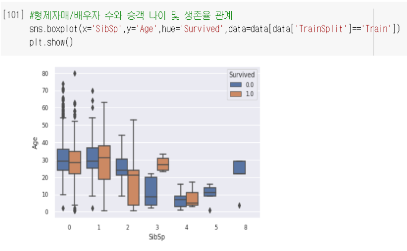 boxplot 함수로 생존여부를 표시하였다. 동승자가 2~3명일 경우, 나이에 따른 생존 여부에 차이가 있다.