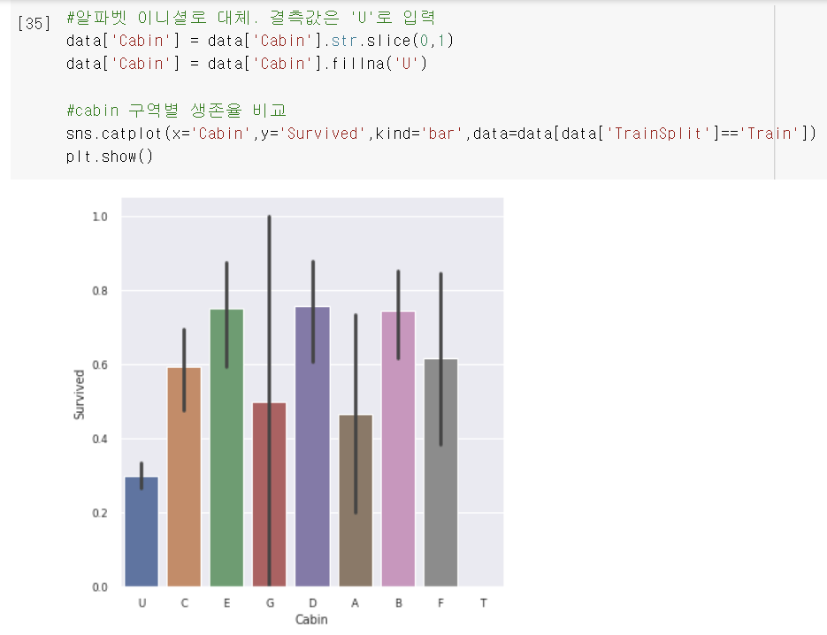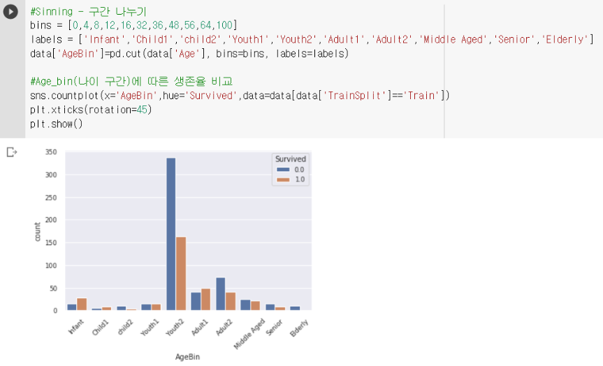 비닝기법 사용한 부분이다. 판다스 cut 함수를 사용하여 각 구간의 경계값(bins), 이름(lables)을 지정하였다.