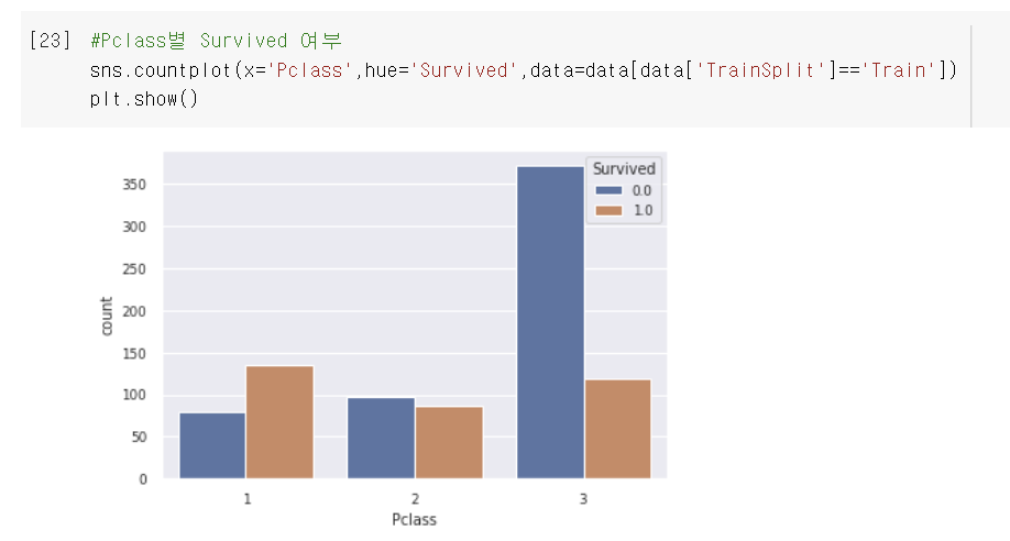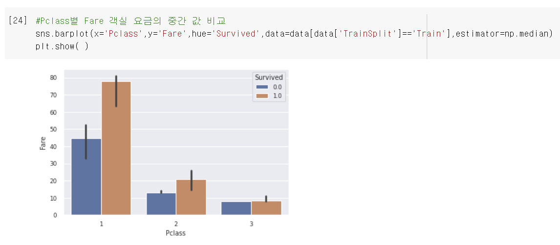 barplot함수를 사용해 등급별 객실 요금의 중간값 분포를 알아보았다. 생존자 비율이 높은 1등석, 2등석을 보면