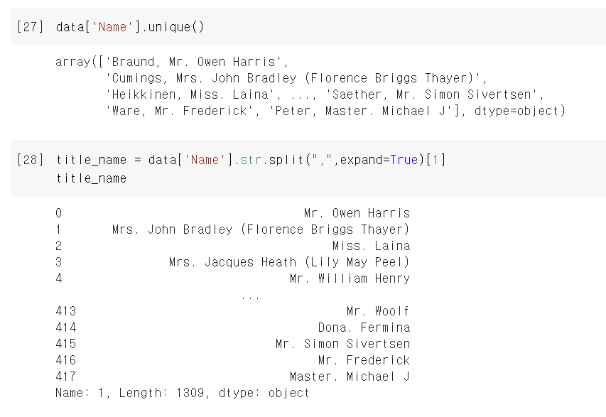 Name 열을 선택하고 str 속성을 적용하면 문자열을 직접 추출할 수 있다. split 메소드를 적용하면 이름을 나타내는