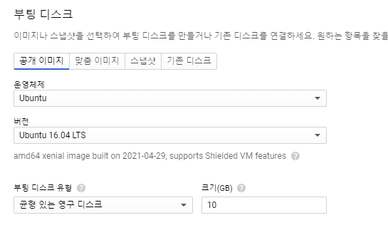 머신유형과 시리즈를 표준으로 변경해주고 부팅 디스크를 Ubuntu 16.04LTS 버전으로 맞춰주었다.