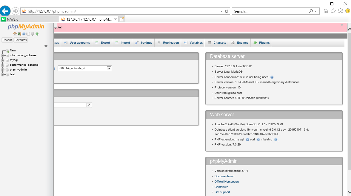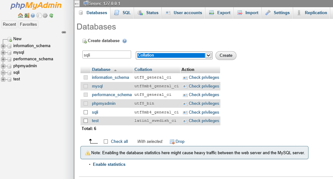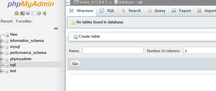 이를 수행하려면 http://127.0.0.1/phpmyadmin에서 phpMyAdmin 인터페이스로 접근해야한다.