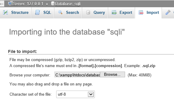 import 탭으로 이동하여 htdocs 폴더에 압축을 풀었던 database.sql 파일을 선택하여 넣어주었다.