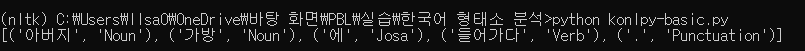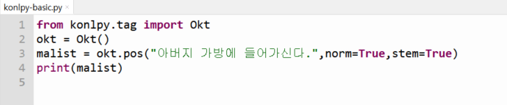 간단한 형태소 분석을 해주기 위해 다음과 같은 코드를 작성해주었다.