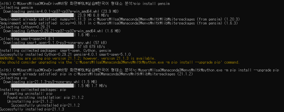다음 실습에서 Word2Vec을 구현기 위해 Gensim 라이브러리를 미리 설치하였다.