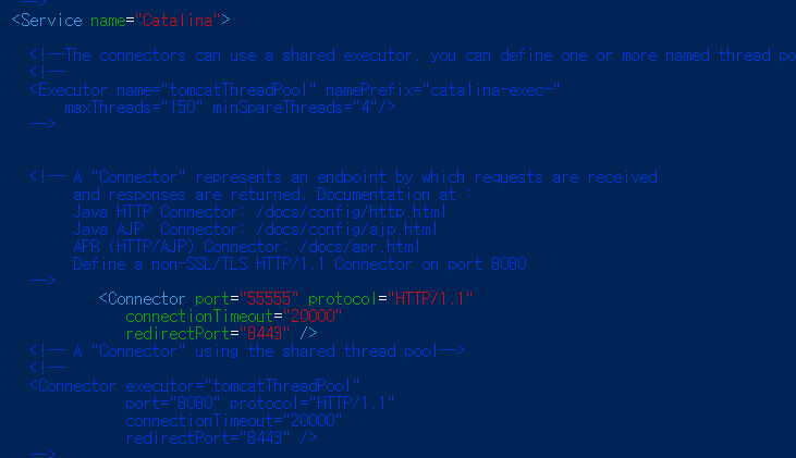 이제 Apache Tomcat의 기본 설정을 변경해 8080 포트가 아닌 55555 포트를 listen하도록 설정해야 한다.