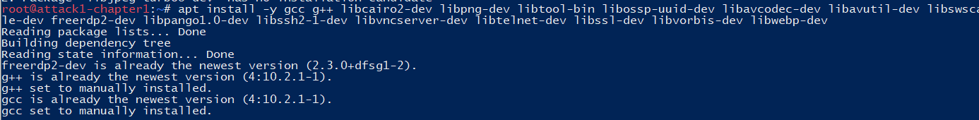 | apt install -y gcc g++ libtool-bin libossp-uuid-dev libavcodec-dev libavutil-dev libswscale-dev freerdp2-dev libpango1.0-dev libssl-dev libwebp-dev |