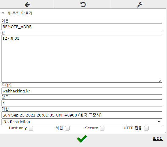 근데 처음에 REMOTE_ADDR 쿠키가 보이지 않아 추가해주었다.