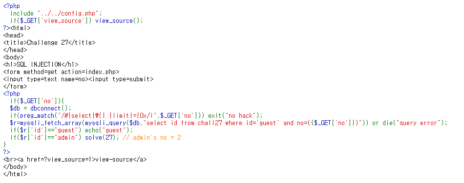 select id from challenge27_table where id='guest' and no=(0) or no = 2)")) or die("query error")