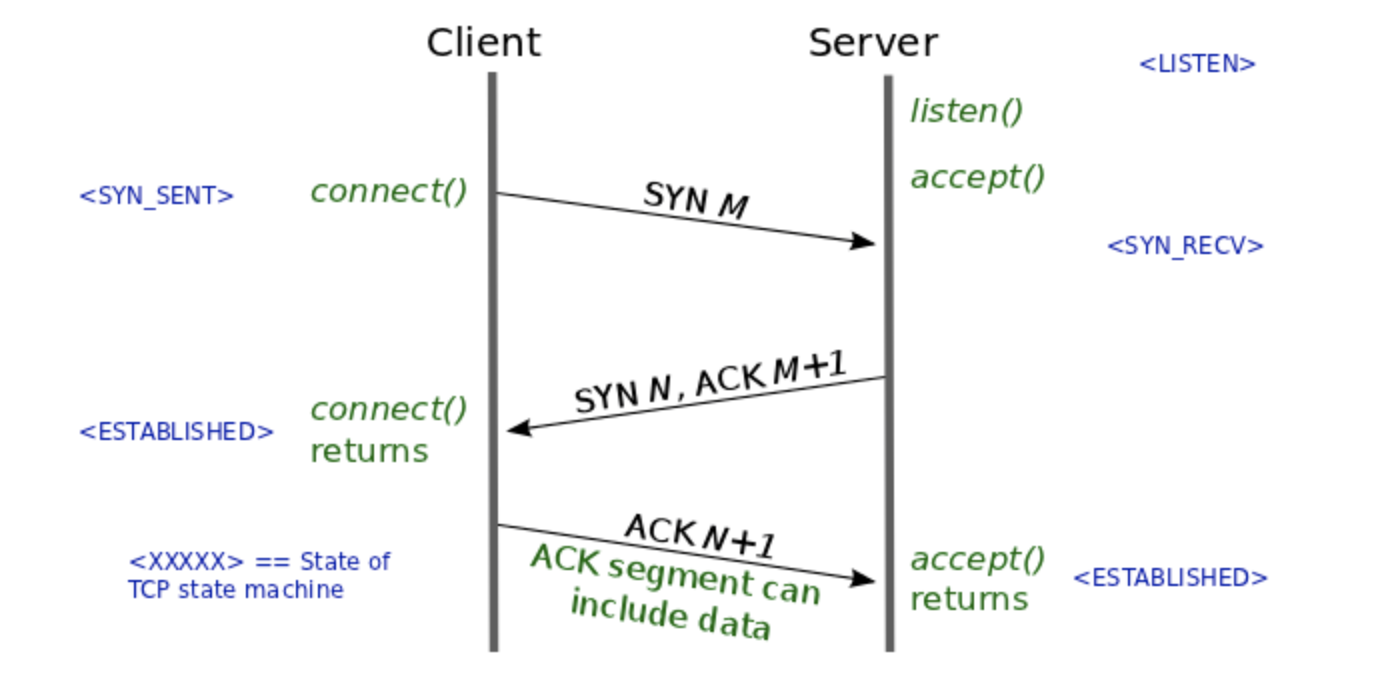 - 클라이언트는 서버의 응답으로 ACK(M+1)와 SYN(N) 패킷을 받고, ACK(N+1)을 서버로 보낸다.