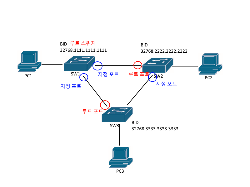 : 전체 스위치 중 브리지 ID (BID) 값이 가장 낮은 것이 루트 스위치가 된다. - 루트가 아닌 스위치 중 하나의 Root 포트로 선정