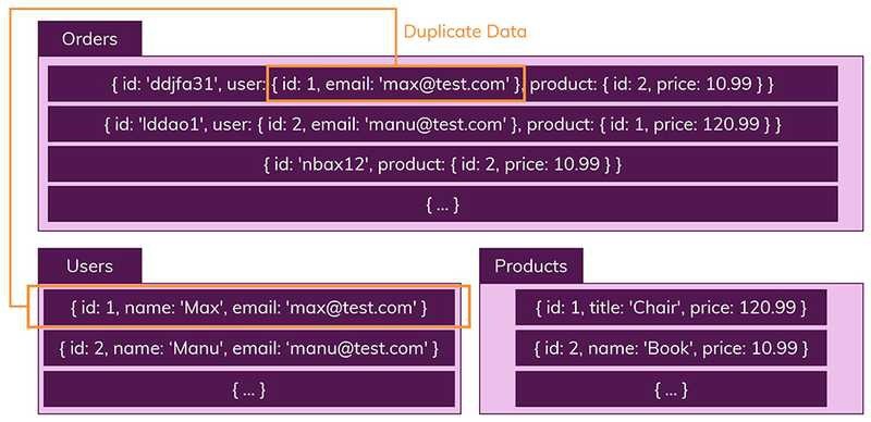 - 데이터가 여러 컬렉션에 중복되어 있기 때문에, 수정(update)를 해야 하는 경우 모든 컬렉션에서 수행해야 함을 의미합니다. (SQL 세계에서는 중복된 데이터가 없기 때문에 한번만 수행하면 됩니다.)