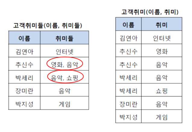 - 취미에 속성이 2개 이상 가지고 있을 경우, 원자값이 아니기 때문에 속성 1개만 가지도록 저장해야한다.