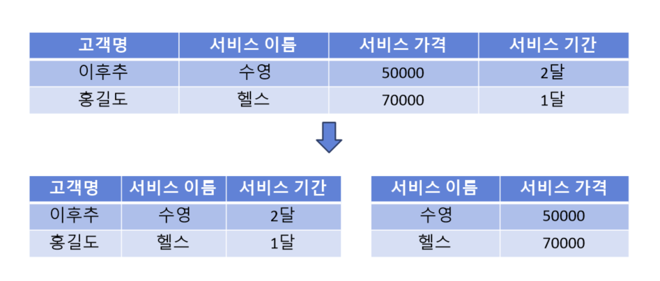 위 테이블을 보면, [고객명, 서비스 이름]이 [서비스 기간]에 영향을 주고, [서비스 이름]이 [서비스 가격]에 영향을 주는 관계를 부분 함수 종속 관계라고 한다. [고객명, 서비스 이름, 서비스 가격, 서비스 기간] 을 한 테이블에 두면, 부분 함수 종속성으로 2차 정규화를 만족하지 못한다. 따라서, 별도의 테이블로 두어야 2차 정규화를 만족할 수 있다.