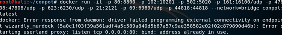 그리고 도커 안에 설치된 포트들을 칼리리눅스의 포트들과 포트포워딩을 해준다.