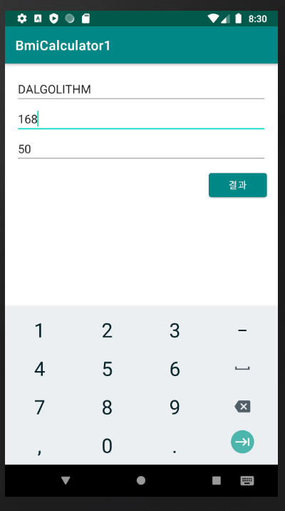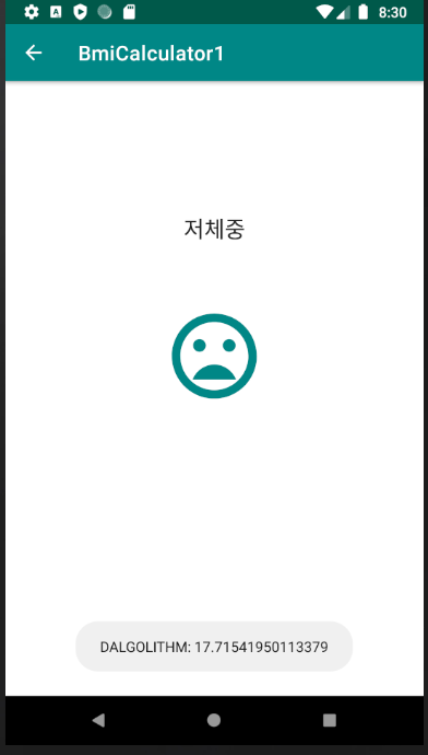 - 결과 화면으로 넘어가면 토스트 메세지로 이름과 BMI 수치가 나타난다.