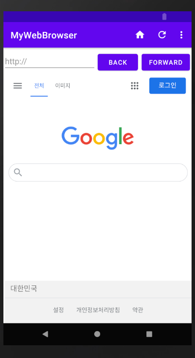 - URL 주소를 입력하여 검색버튼을 누르면 웹페이지가 화면에 표시된다.
