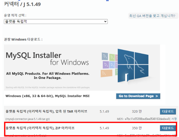 ✔ JDBC 드라이버(mysql-connector-java-5.1.49 설치) 방법 선택