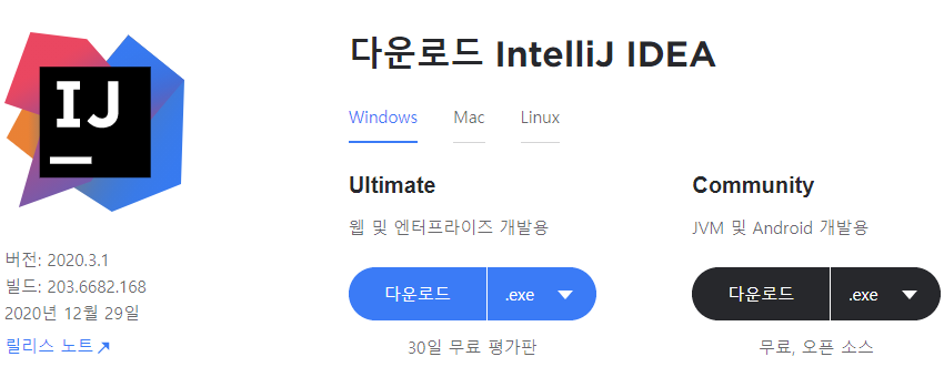 커뮤니티 버전은 무료로 다운로드 가능하다.