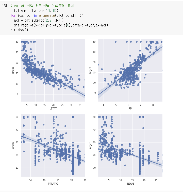 LSTAT와 RM의 선형 관계가 뚜렷하다.